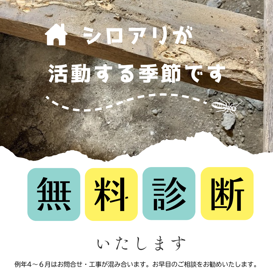 この時期は、シロアリの活動が活発化する季節でもあります。知らぬ間に大切なお住まいが侵害されている可能性も...。みつわリフォームでは無料でシロアリ診断を行い、皆様の大切なお家を守るお手伝いをしております。